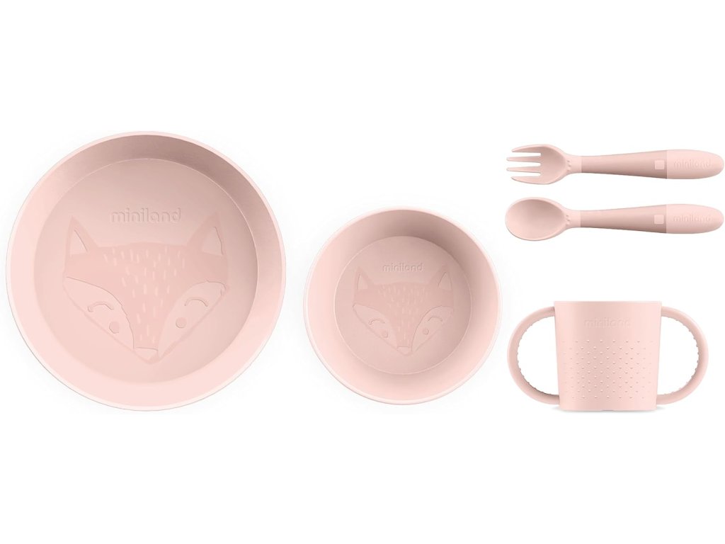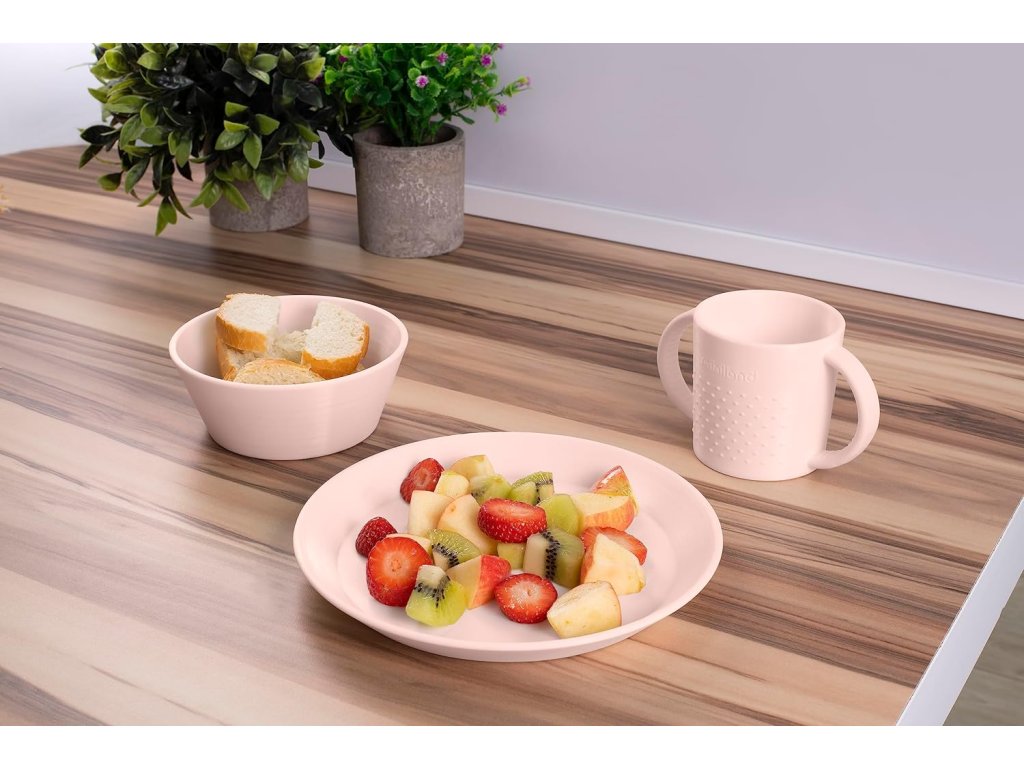 Jídelní sadu tvoří talíř, miska, hrnek se 2 uchy, pružná lžička a vidlička. Talíř i miska s vysokými okraji pomáhají snadnému nabírání pokrmu. Lžička a vidlička jsou vyrobeny z flexibilního příjemného materiálu a mají neklouzavá, kulatá držadla, která usnadňují dítěti držení. Hrnek se dvěma uchy pomáhá dítěti naučit se pít z klasického hrnku. Všechny části jídelní sady je možné mýt v myčce a používat pro ohřátí pokrmu či nápoje v mikrovlnné troubě. Složení: PP Vhodné pro děti od 6 měsíců.Doplňkové parametry