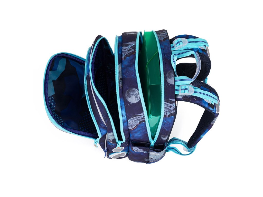 Batoh má dvě objemné hlavní komory. Do nejširší zadní komory dejte nejtěžší učebnice nebo desky na sešity, abyste rozložili váhu učiva. Přední komora je o něco užší, je v ní ukrytá malá síťová kapsa na zip a jmenovka.