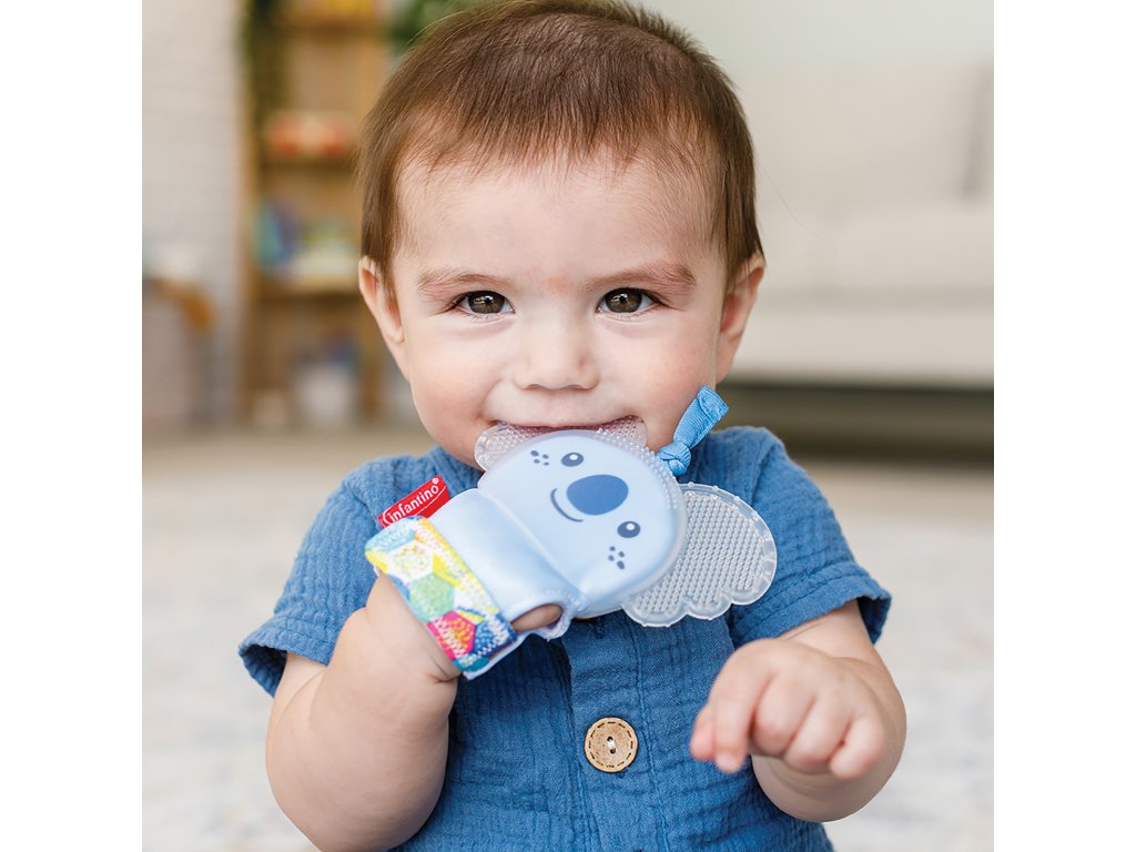 Rukavička se zapínáním na suchý zip je vyrobena z měkkého a jemného materiálu. Součástí rukavičky je silikonové kousátko v podobě medvídka koaly. Jemný silikon s různými texturami pomáhá přinášet úlevu citlivým dásním vašeho dítěte při prořezávání prvních zoubků. Pro čištění je možné kousátko z rukavičky sejmout. Rozměry: 11,5 x 10,5 cm Vhodné pro děti od narození.Doplňkové parametry