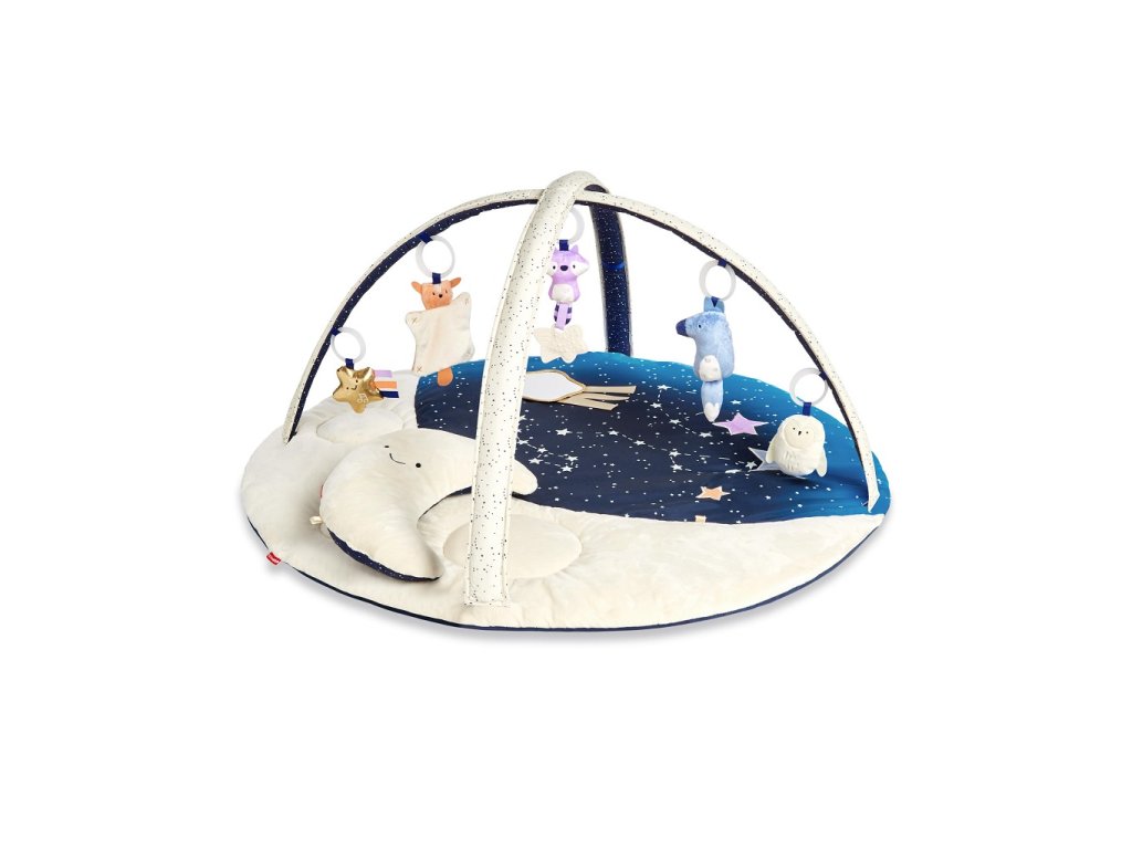 Překrásná deka na hraní s nebeským motivem, plyšovým prošíváním a měkoučkým polštářkem ve tvaru měsíčku s praktickými úchyty na hračky na pohodlnější hru na bříšku. Odnímatelné dětské zrcadlo ve tvaru padající hvězdičky podporuje sebepoznání, zatímco pět závěsných hraček, z toho jedna hudební, zapojí smysly vašeho děťátka díky hudbě, zvukem, texturám a dalším prvkem na zkoumání.