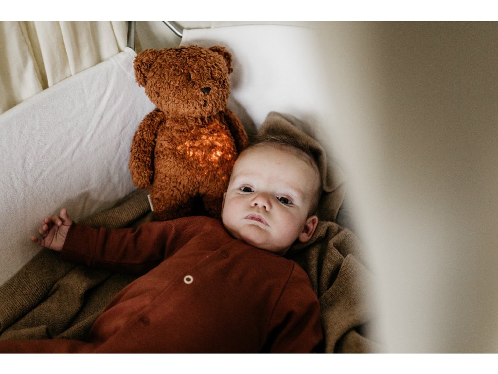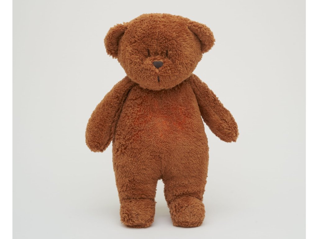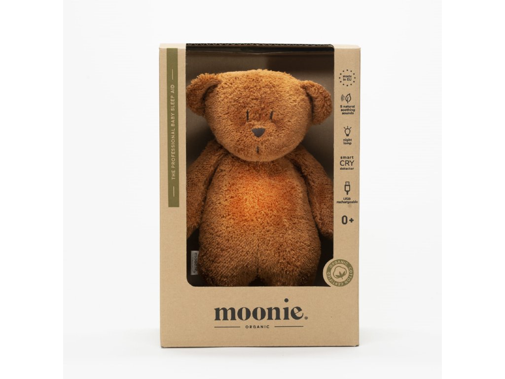 Moonie usínáček v podobě roztomilého medvídka s nočním světlem a relaxačními zvuky pomáhá miminku uklidnit se a snáze usnout. Uklidňující zvuky připomínají dítěti prostředí v děloze maminky před jeho narozením. Usínáček nabízí pět přírodních relaxačních zvuků (tlukot srdce, vítr, lesní potok, mořské vlny, déšť), kalimba ukolébavku, dvě klasické ukolébavky a umožňuje nahrání vlastního hlasu. Bříško medvídka svítí a slouží jako noční světlo s výběrem sedmi barev svícení. Jemné světlo pomáhá dítěti cítit se v postýlce bezpečně. Světlo je možné zapnout i bez zvuků. Při zapnuté funkci Shake světlo zapnete zatřesením hračkou. Medvídek se při svícení nijak nezahřívá a je pro dítě zcela bezpečný. Funkce časovače umožňuje nastavit dobu přehrávání na 30, 60 nebo 90 minut, než modul přejde do režimu inteligentního senzoru pláče. Inteligentní senzor aktivuje zvuk a světlo, když dítě začne plakat. Hračka pak přehrává relaxační zvuky a jemně svítí po dobu 20 minut. Hudební modul umožňuje nastavení hlasitosti a doby přehrávání dle vašich preferencí. Hračka se dobíjí s pomocí USB kabelu, k plnému nabití potřebuje 3 hodiny. Plně nabitá baterie vydrží až 8 hodin nepřetržitého provozu se zapnutým světlem a zvukem. USB kabel je součástí balení. Po vyjmutí zvukového a svítícího modulu můžete hračku prát v ruce. Medvídek je součástí produktové řady Moonie Organic, vyráběné z cetifikované organické bavlny, barvené netoxickými barvami. Bavlna pochází z produkce bez použití pesticidů a toxických hnojiv. Při pěstování organické bavlny se používá o 50% méně vody ve srovnání s průmyslovým pěstováním. Výplň hračky tvoří recyklovaný materiál. Hračka byla testována švýcarskou laboratoří SGS a je v souladu se směrnicí 2009/48/ES o bezpečnosti hraček. Rozměry: 28 x 16 x 10,5 cm Vhodné pro děti od narození.Doplňkové parametry